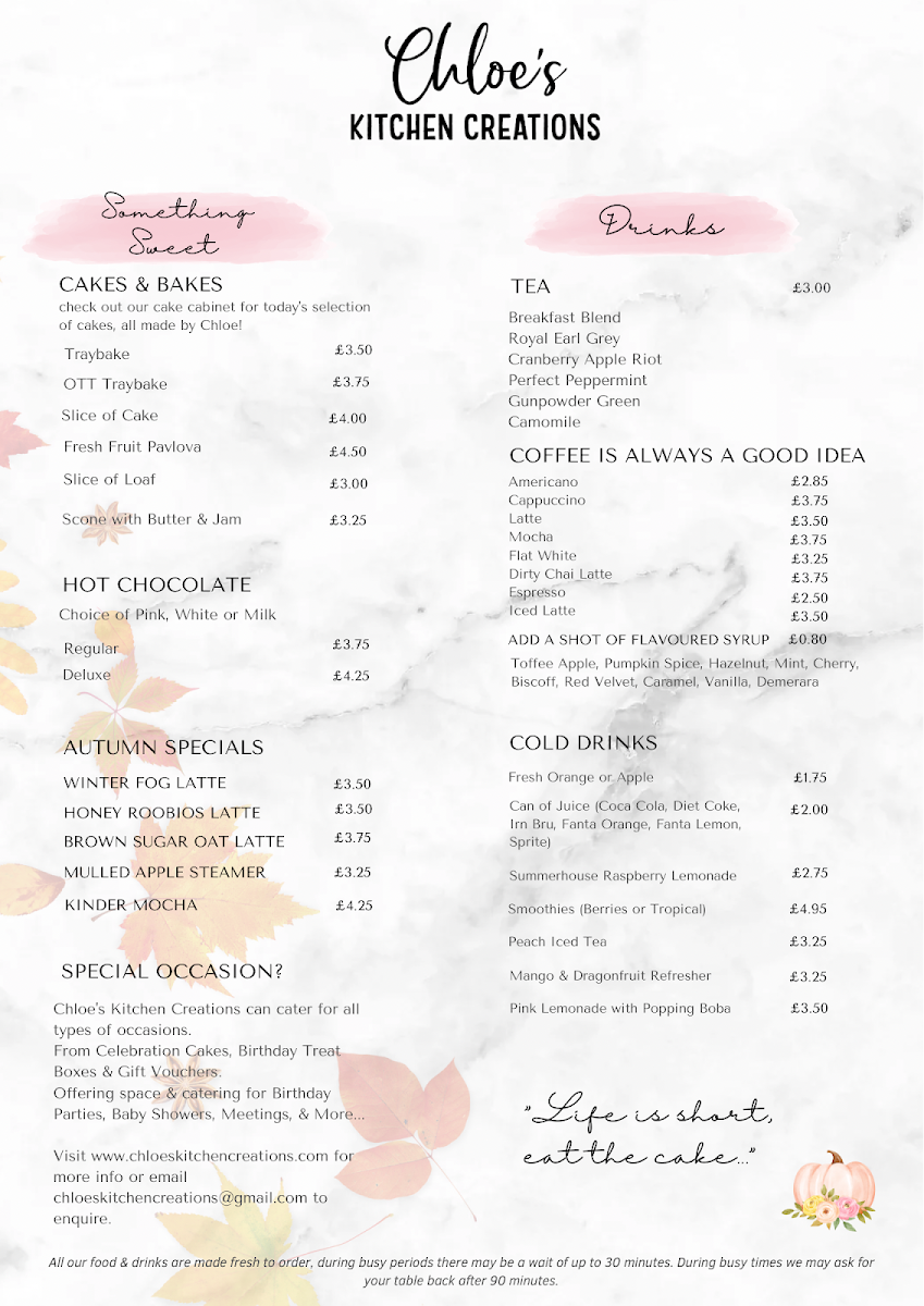 Whether it’s a friendly chat over coffee, a delicious lunch, or an indulgent slice of cake, Chloe’s Kitchen Creations embodies the spirit of community, quality, and comfort. Perfect for those lazy afternoons or busy mornings alike, this café is sure to become a favorite for anyone who steps through its doors.